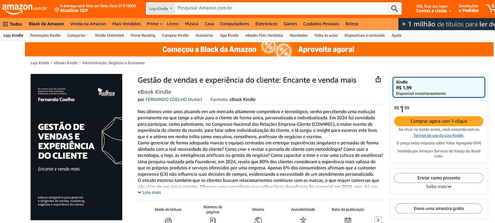 A Black da Amazon está chamando a atenção de leitores em todo o Brasil, especialmente daqueles que atuam nas áreas de gestão, vendas e experiência do cliente. Um dos destaques da campanha é o livro “Gestão de Vendas e Experiência do Cliente – Encante, Converta e Fidelize”, de Fernando Coelho, que na versão Kindle teve seu valor reduzido para apenas R$ 1,99.